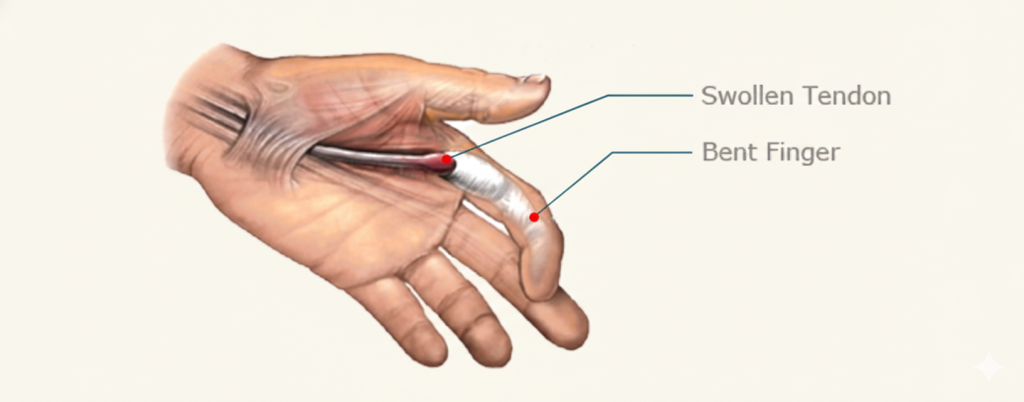 When the opening of the pulley becomes too narrow—often due to inflammation or thickening—the tendon can no longer glide smoothly. Instead, it hitches, catches, or “locks” in place. In some cases, a small nodule or bump forms on the tendon, making it even harder to pass through the sheath.
